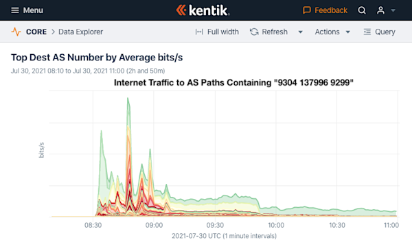 Based on our aggregated netflow, we can see the impact of this event as a spike in traffic volume to flows with AS paths containing the subsequence “9304 137996 9299”. While the majority of the traffic misdirection occurred within the first hour, we can see impact lasting over two hours for some routes.