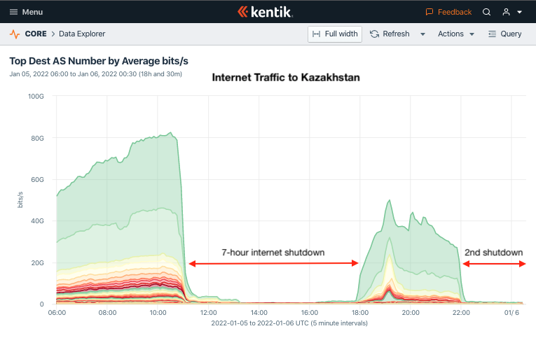 According to Kentik aggregate NetFlow data, internet traffic to and from Kazakhstan stopped at 10:45 UTC (4:45pm local) and has yet to be restored.