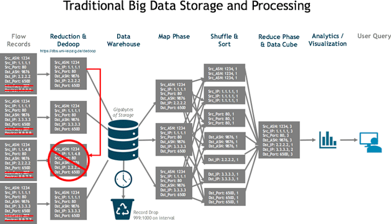 Needless to say, the little straw hut of sparse, summarized data was no match for the huffing and puffing of real-world use cases. When the big bad wolf came to the door, the system collapsed. Traditional Big Data Wood House The second organization chose to build using a traditional, Hadoop-style big data system. While this allowed much more space for data, it was still rather fragile. Like most such systems, it had to discard data by subsampling the flow records it received. What was left was MapReduced into data cubes — basically complex multi dimensional counters— which reduced cardinality and created duplicates that had to be resolved because they could no longer tell the difference between them. The cubes were essentially pre-digested data, which made it easier for a single-server system to return quick responses to queries. The problem was that they lose fidelity, and they had to pre-build the data cube to run a query, a process that took from minutes to days.