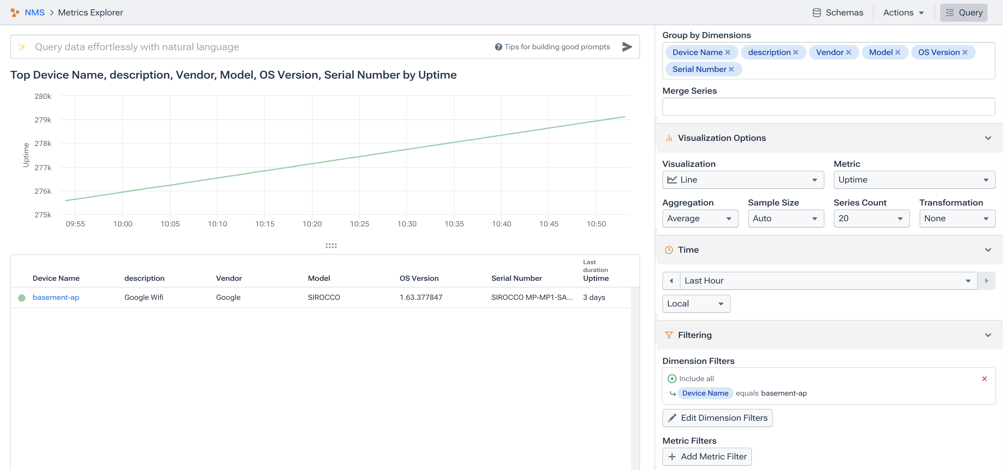 /system,description=Google\ Wifi,device_ip=x.x.x.x,device_name=basement-ap,location=(REDACTED),model=ACjYe,os-version=14150.376.32,serial-number=GALE\ C2E-A2A-A3A-A4A-E5Q,vendor=Google uptime-sec=2801i 1708881351000000000Now I hop over to the Kentik UI, where I am sending the Influx data, and I can see I am collecting the data there as well.